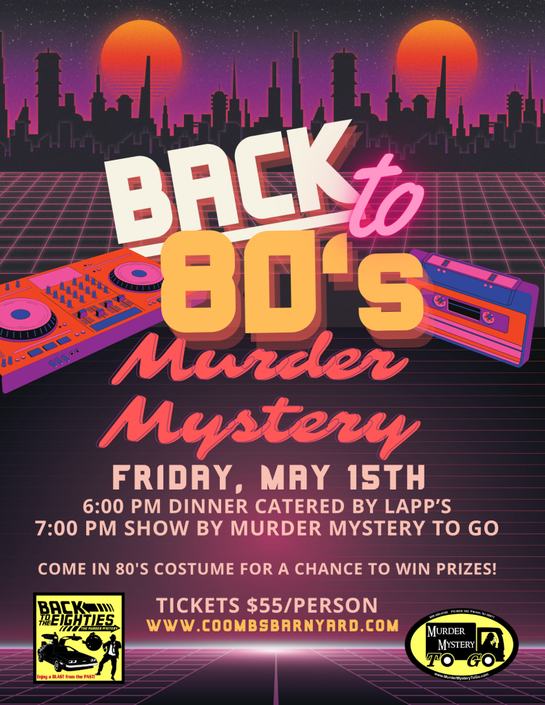Join us for an unforgettable night of mystery, mayhem, and mouthwatering food at our Murder Mystery Dinner in the Barn on FRIDAY, May 15th! Enjoy a buffet dinner by Lapp’s starting at 6:00 PM, followed by the interactive murder mystery show at 7:00 PM. Tickets are required for this event ($55/person) and are limited so grab them while you can!