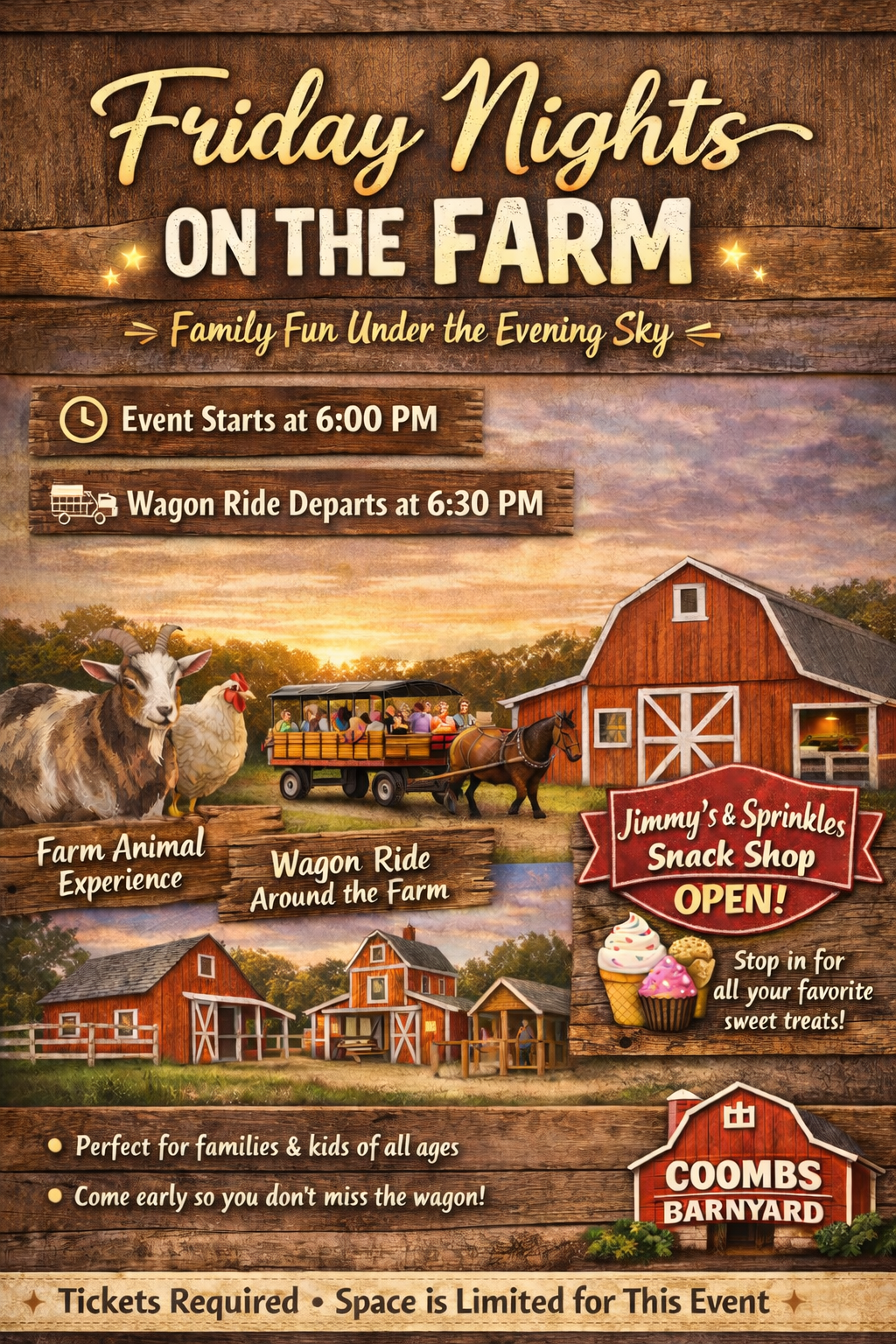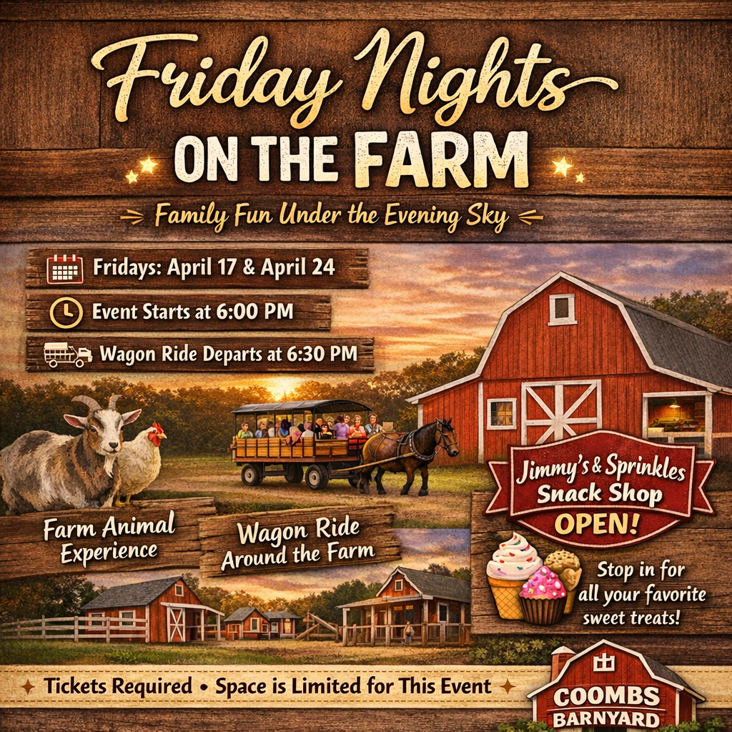 Join us for a delightful evening on the farm that is perfect for any age! Experience a wagon ride, adorable farm animals, and time in our Barn Village. Event includes wagon ride (leaves at 6:30 pm), visit with our barnyard friends, and open play in our Barn Village. Jimmy’s & Sprinkles will also be open during this event so you can grab all your sweet treats!