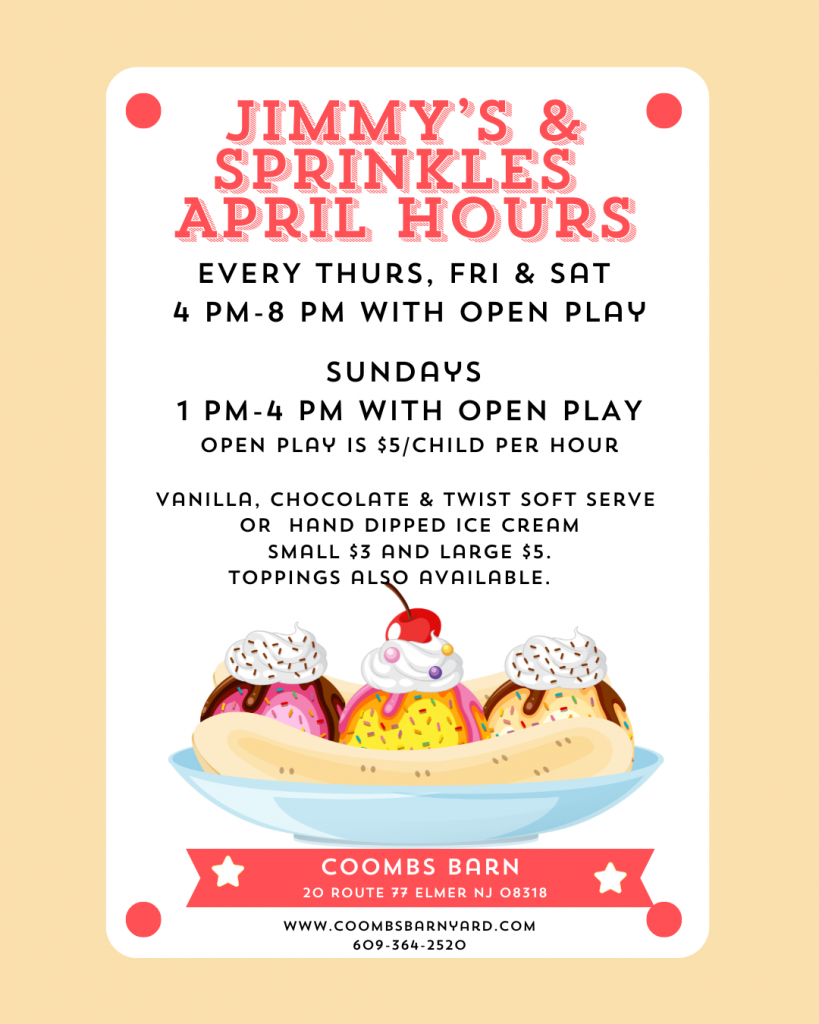 Jimmy’s & Sprinkles will be open Thurs, Fri and Sat. from 4-8 pm with OPEN PLAY in the Barn Village. Also open Sundays 1-4 pm with OPEN PLAY in the Barn Village.
