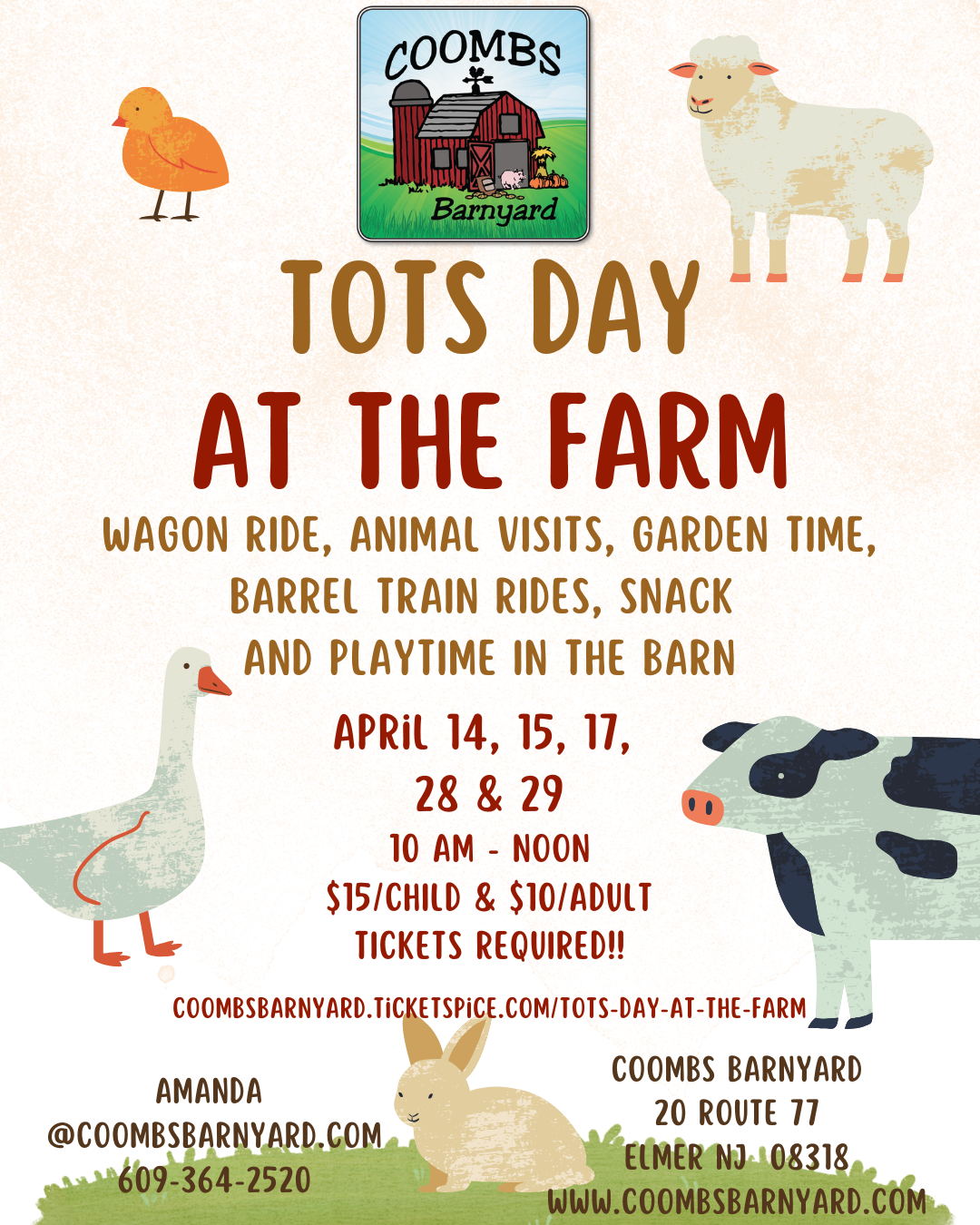 Join us for a delightful morning at the farm designed especially for toddlers! Experience hands-on activities, adorable farm animals, and outdoor fun. Event includes wagon ride (leaves at 10:30), visit with our barnyard friends, time in our garden, barrel train rides and open play in our Barn Village.