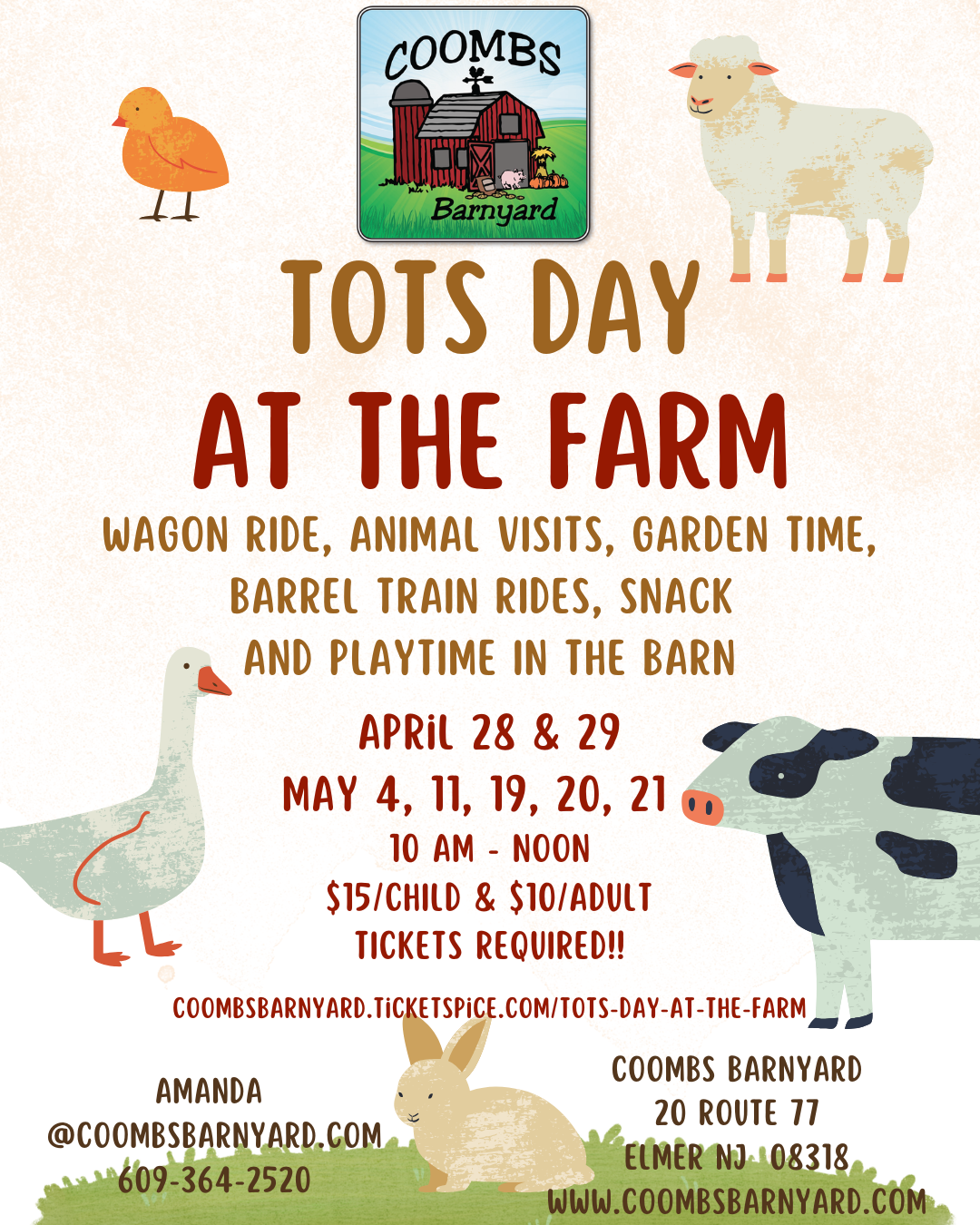 Activities Include: Wagon Ride, Animal Visits, Gardening, Barrel Train Rides, Snack and Playtime in the Barn.